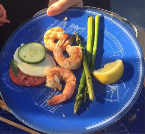 Jenny prepared an amazing supper with shrimp on sticks and a salad made with tomatoes, cheese, cucumbers.