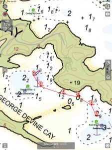 As there is a front (or two) on the way we consider where we might go to anchor to gain some comfort from the wind and the seas. Stocking Island provides great protection from the prevailing easterlies but can become rather unruly in a south or west wind. We learn about a group of anchorages behind Crab Cay known as Red Shanks Anchorages.